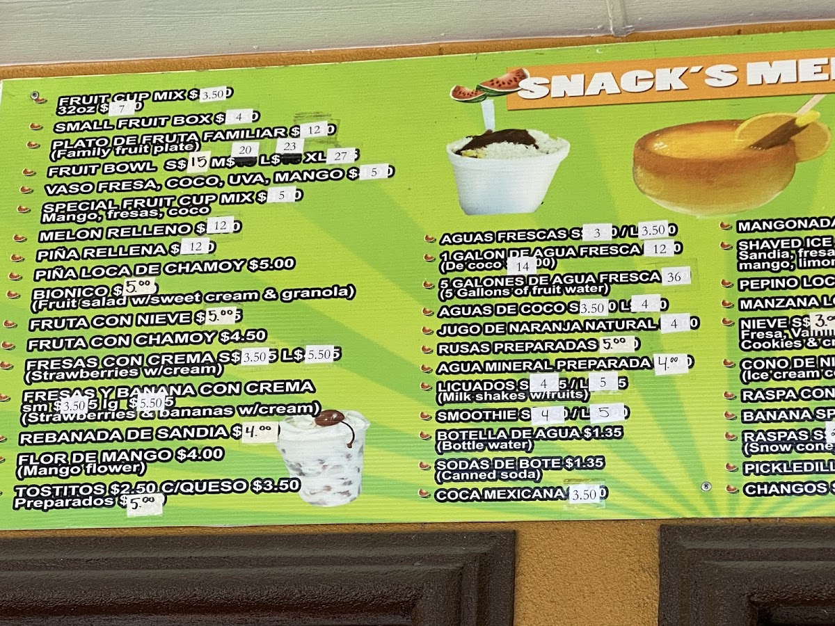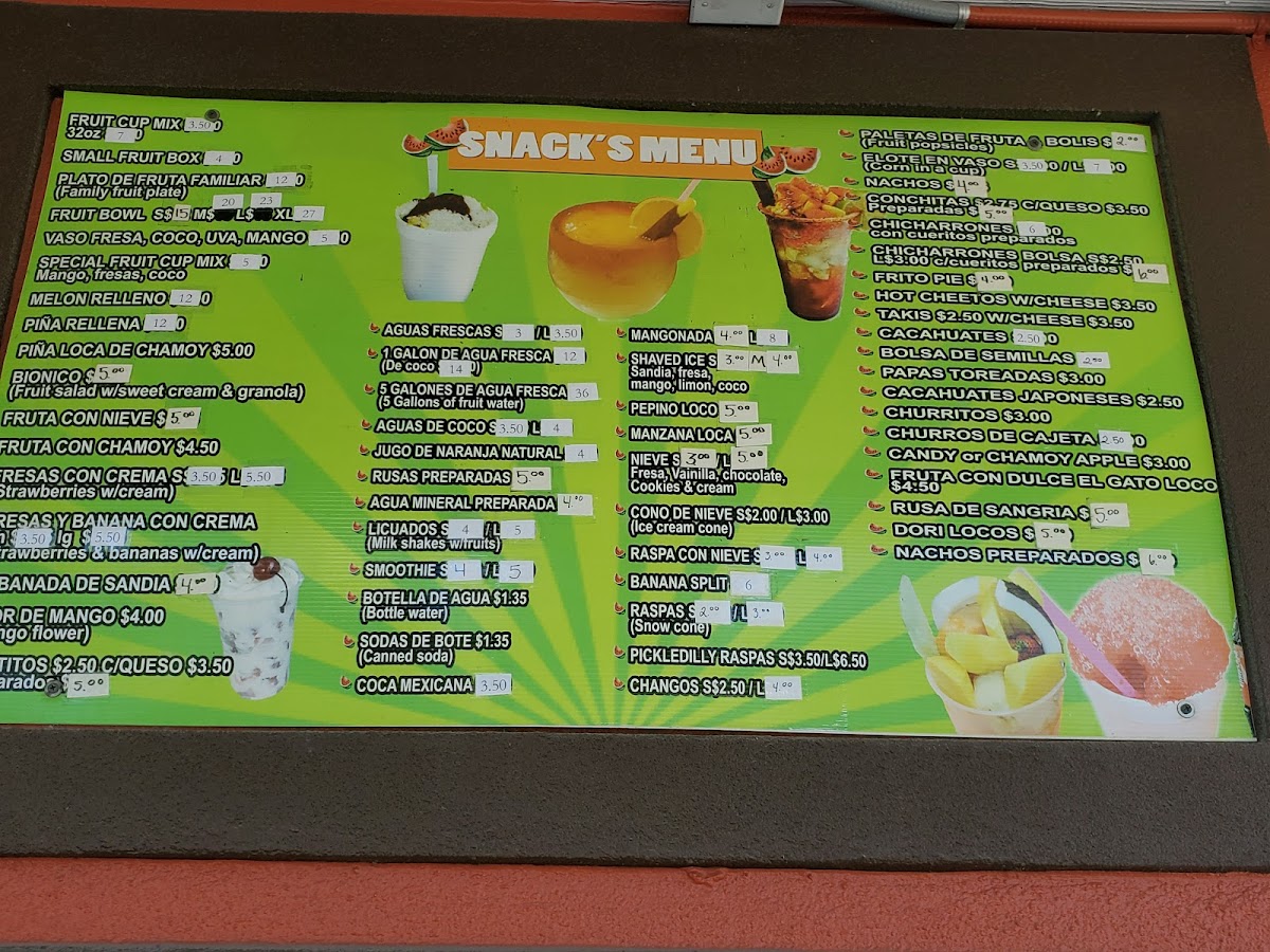 Throughout the day, guests can explore light bites and refreshing treats such as fresh fruit bowls, mangonadas, and prepared fruit cups that add a bright, fresh contrast to the more robust offerings like enchiladas verdes or fajitas. The menu also features unique selections like tripas mini tacos, corn in a cup, and flavorful sides including salsa ranchero and frijoles charros, which complement the relaxed, vibrant atmosphere.